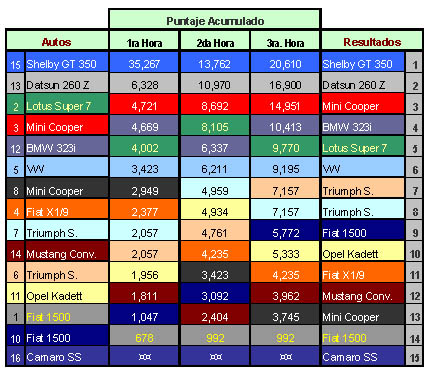 El siguiente cuadro muestra una evolución resumida durante las tres horas de la prueba. Cada auto esta representado por un color, por lo que les resultará fácil seguir la evolución de los