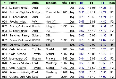 Carlos Andrés Salazar había mejorado sus tiempos con respecto a la 1era fecha y a pesar de que Lumber Núñez partió mejor, el Honda Integra de Salazar pudo remontar y cortar así la racha del Audi. El siguiente rival fue Percy Sánchez, su Impreza, un auto de 12 segs, tuvo problemas, por eso su ubicación, él partió excelente, el Honda desde atrás parecía alcanzarlo pero no lo consiguió, aunque sus ETs fueron casi iguales.