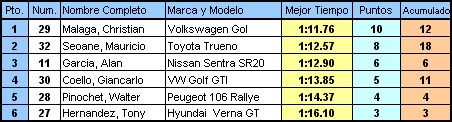 Málaga en su Volkswagen Gol comenzó con buen pie la fecha, asumió el liderato tras la primera manga, seguido de cerca solo por Mauricio Seoane en el Trueno negro, ambos rodaban en 1:14.