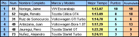 En la última manga, el Golf de Ruiz de Somocurcio no fue de la partida, por un problema de frenos y dejó la definición del liderato entre el GT4 y el Escarabajo. Noriega en el VW salió con todo, era la vuelta definitiva, sus tiempos parciales eran parecidos a los más rápidos de la Superior 1, todo iba extraordinariamente bien, hasta que en una curva cerca de la llegada, sucedió lo inesperado, Noriega llegó demasiado rápido cruzo el auto y el neumático no pudo más y se desenllanto en el acto, provocando un fuerte chirrido producido por el choque del aluminio del aro contra el asfalto, una lástima, porque hasta ese punto su tiempo era semejante a los que lograban los mejores autos de la Superior 1 (ver-video). La oportunidad estaba servida en bandeja para Neglia y su Toyota GT4.