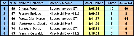 La primera manga fue favorable para los Evos, específicamente para el de Enrique Frech, quien fue el único que realizó un tiempo aceptable. Para la siguiente manga, casi todos mejoraron sus tiempos y los Subarus tomaron la punta con el Impreza de PP Chang, pero seguido de cerca por el Evo pilotado por Claudio Valderrama.