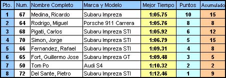 En realidad, luego de lo ocurrido, pocos veían en el Porche un rival de cuidado para Medina; en su última pasada Miguel Rodrigo mostraría todo su potencial, salió muy decidido, el Porsche transcurría muy bien por el curso , usando sus anchos neumáticos al límite de su agarre; al pasar por los sensores de llegada, el tiempo de Miguel se mostró en el display y nadie lo podía creer, quedó a solo una centésima (0.01) del tiempo de Medina, realmente pocas veces se ven resultados tan ajustados, pero son bienvenidos, sobre todo por los espectadores.
