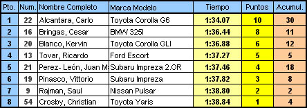Los dos pilotos más rápidos de la fecha anterior, Carlo Alcántara, en el Toyota Corolla G6 y Juan Manuel Pérez, en el Impreza 2.0R, se enfrentaron lado a lado. Partieron raudos, parecía que el Impreza alcanzaría al Corolla, pero la salida de las “U” fue mejor para el Toyota, Juan Manuel en su ímpetu por alcanzar al campeón de 2006, cometió algunas infracciones que le luego le pasarían la factura, relegándolo finalmente al 5to puesto. Alcántara marcó 1 minuto 34 segundos para su mejor tiempo.