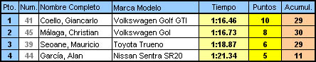 Mauricio Seoane, no pudo mejorar su tiempo en la última manga y tuvo que conformarse con el tercer lugar. El primer puesto se definiría entre los dos Volkswagen. El primero en salir a la pista, fue Giancarlo Coello, a pesar de hacer una buena vuelta , no pudo mejorar su tiempo , solo le quedó cruzar los dedos para que Cristian Málaga no rebajara el 1:16.46. Málaga, salio a la pista un poco después que el Gol de Coello, mejoró su marca personal pero no lo suficiente para superar a su compañero de equipo