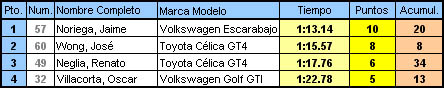 Luego de una fecha de descanso obligado, por una falla en su vocho, Jaime Noriega regresó al Autox, dispuesto a descontar puntos a Renato Neglia en el campeonato. Otra novedad era la presencia de José Wong, ganador la fecha pasada en otra categoría, compartiendo manejo del Celica GT4 con Neglia.