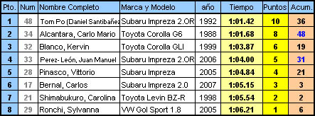 Daniel Santibáñez "Tom Po", a bordo esta vez de un Impreza 2.0R, realizó el mejor tiempo en la primera manga, aunque seguido de cerca por Juan Manuel Pérez-León (en el mismo auto) y Carlo Alcántara en el Corolla G6.