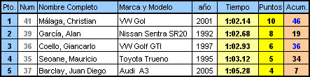 En la primera manga, Málaga en su VW Gol marcó el mejor tiempo, seguido por Alan García en el Sentra SR20. En la siguiente manga, Coello mejoró sus tiempos y paso de tercero a líder del grupo , aunque esta posición le duraría poco, pues Málaga, que salió poco después, logró recuperar el puesto.