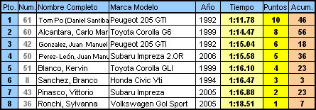 Los tiempos caían constantemente, el campeón ya coronado del 2007, desde la fecha pasada, Carlo Alcántara, hizo el mejor crono 1:14.47, inmediatamente después salió Tom Po, a bordo del 205 GTI y bajó en 1 segundo y medio .
