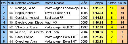 En la primera manga, Jaime Noriega marcó un tiempo que lo alejó casi 7 segundos de sus rivales (1:11.02), mientras que Renato Neglia en el Celica GT4, quedaba un poco relegado en el 6to puesto.