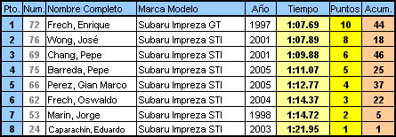 Justamente, en la primera manga, José Wong logró el mejor tiempo, seguido por Pepe Barreda y Gianmarco Pérez (ambos en el mismo Impreza). Pepe Chang se quedaba un poco atrás, en 7mo puesto.