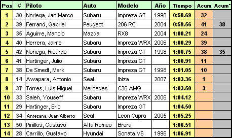 La 1ra manga fue favorable para Jan Marco Noriega, mientras que la 2da y 3ra manga lo fueron para el Peugeot 206RC de Gabriel Ferrand. Quedaban aún dos mangas por disputarse, Jan Marco salió con todo en busca de la punta, rebajó consecutivamente sus tiempos; pero Gabriel Ferrand también mejoró aunque no tanto como Jan Marco, finalmente este se impondría a bordo de su GT Turbo, marcando un tiempo de 58.69, de esta forma, ganó su primera carrera del año. Por su parte, Gabriel Ferrand con el 2do puesto en esta carrera, aumentó sus posibilidades para obtener el campeonato, lo definirá con Jaime Herrera en la última fecha.