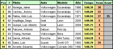 Dos de los Escarabajos más potentes del medio, disputaron los primeros lugares de la categoría, ambos autos instalaron neumáticos blandos, por lo que fueron penalizados con 2 segundos en todas sus vueltas. Jaime Noriega logró establecer una ligera distancia sobre el otro Escarabajo, pilotado por Aldo Palma y Johny Cachay.
