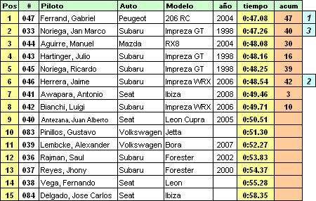 Jaime Herrera y Gabriel Ferrand, disputaron el campeonato en esta fecha final, debido al descarte de una fecha, Jaime Herrera en su Impreza WRX tenía ventaja de 2 puntos sobre el Peugeot 206RC de Ferrand. Desde la primera manga, Ferrand se apoderó del primer lugar, en la segunda Ferrand mantuvo el liderazgo, mientras que Jaime Herrera lo seguía a poco más de 1 segundo en el 4to lugar.
