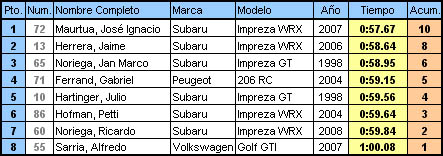 La primera manga dejó como saldo a Peti Hofman con el mejor tiempo, seguido por el sorprendente Peugeot 206RC de Gabriel Ferrand y el clásico Impreza GT de Jan Marco Noriega.