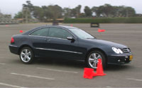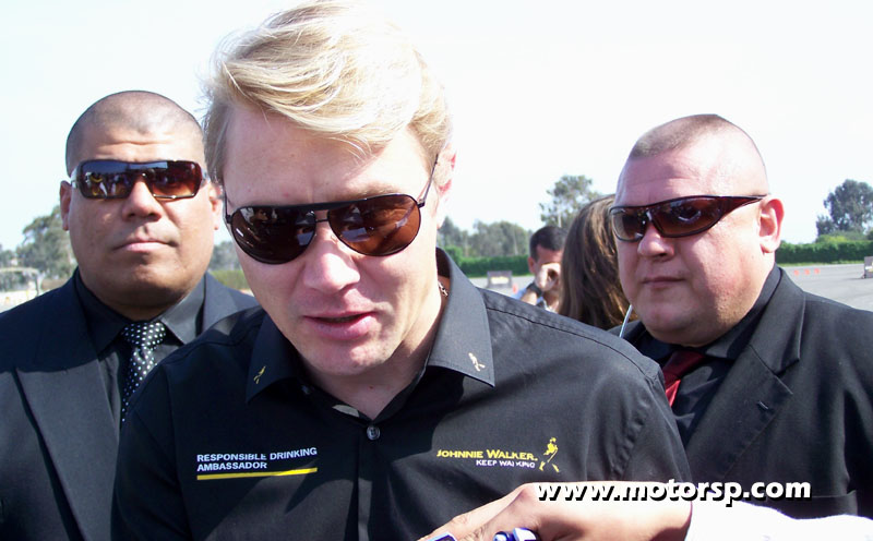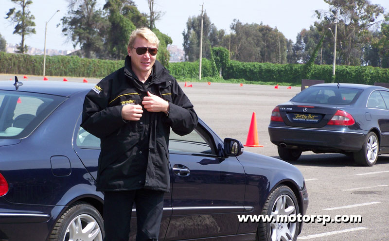 El tiempo disponible estaba justo, el campeón demoraba más de la cuenta por sus compromisos de la mañana, el público se empezaba a impacientar. Me habían dicho que en la Argentina Mika modificó el circuito que habían hecho para él y que eso provocó aún más demoras; no se podía correr ese riesgo, olvidé por unos momentos mi renuencia a usar autos ajenos, arranque el Mercedes Benz 350 CLK, un V6 con cerca de 300 hp, elegido para el campeón, calenté el motor apenas unos momento y salí raudo a probar el circuito, el auto derrapaba con mucha facilidad, por lo resbaloso de la pista, pero un chasis bien hecho y las permanentes e irrenunciables ayudas electrónicas hacían que el noble vehículo pudiera llevarse sin sobresaltos, fue muy divertido probar la aceleración y frenadas extremas, confirmando también su capacidad para tomar curvas de todo tipo, con absoluto control.