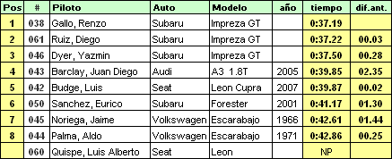 Yazmín Dyer se acercó al tiempo del puntero Renzo Gallo, pero no lo suficiente para superarlo, mientras que Diego Ruiz, uno de los últimos en salir al circuito, logró bajar el tiempo de Yazmín y colocarse segundo, a solo 3 centésimas del tiempo del ganador de la fecha. En el duelo de los VAS-Sport, Juan Diego Barclay, volteó los papeles y superó por 2 centésimas (0.02) a Luis Budge, logrando por este pequeño margen, el 4to puesto final de la categoría.