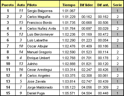 A continuación la tabla de las posiciones de la clasificación y su orden en las 2 series clasificatorias (carreras) a disputarse, previas a la gran final.