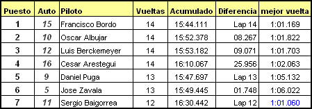 En la 3ra vuelta, Luis Labarthe aprovechó un descuido de Carlos Núñez, y le quitó el segundo lugar. Luego de esto, Labarthe empezó a mejorar sus tiempos al seguir a Carlos Maguiña, marcando el record de la serie en la vuelta 8, 1:01.129.
