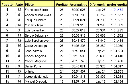 La bandera a cuadros se bajó con Francisco Bordo a la cabeza, fue su 2da victoria consecutiva del año. Carlos Núñez llegó 2do, en la cola del ganador. Una soberbia actuación de los pilotos trujillanos que coparon 4 de los 5 primeros puestos, completando con Enrique Umbert, Oscar Albujar y Luis Labarthe, 3ro, 4to y 5to respectivamente.