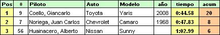 En la 4ta manga, Coello en su Yaris consiguió una vuelta por el curso correcto, sin penalizaciones, mejorando el tiempo del Camaro de Noriega, lamentablemente el V8 no pudo continuar en competencia, dejando el camino libre para el Yaris. Giancarlo remato su última manga con un 44.58, ganando con ello, dos fechas consecutivas.
