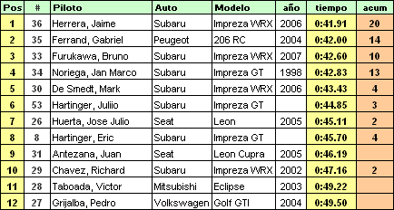 Nuevamente se instaló el ya clásico duelo entre el Impreza WRX de Jaime Herrera y el Peugeot 206RC de Gabriel Ferrand. La primera manga fue para Jaime Herrera, logrando ser el único de la categoría en entrar en los 42 segundos.