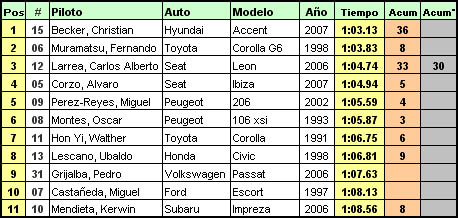 En la 1ra manga, Christian Becker ubicó a su Hyundai Accent en el segundo lugar, pero en la siguiente manga mejoró su tiempo y asumió el liderato, su más cercano competidor fue Fernando Muramatsu en un Corolla G6, él lo escoltó durante el resto de la carrera, sin poder superar el tiempo impuesto por Becker en la 4ta manga (1:03.13). Con esta victoria, Christian consigue empatar el primer lugar del campeonato con Carlos Bernal, ausente por tres fechas, pero que esperamos, reaparezca en la última para definir el titulo.