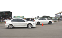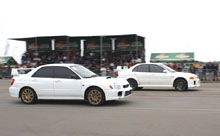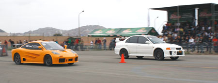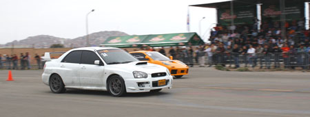 Paolo Pfuyo y Flavio Solórzano, dos retornos importantes en las carreras de aceleración disputaron el clásico duelo entre Impreza y Evo. La partida fue muy pareja, ambos autos salieron lado a lado pero un poco más adelante, el Evo logró tomar la delantera y la mantuvo hasta el final.